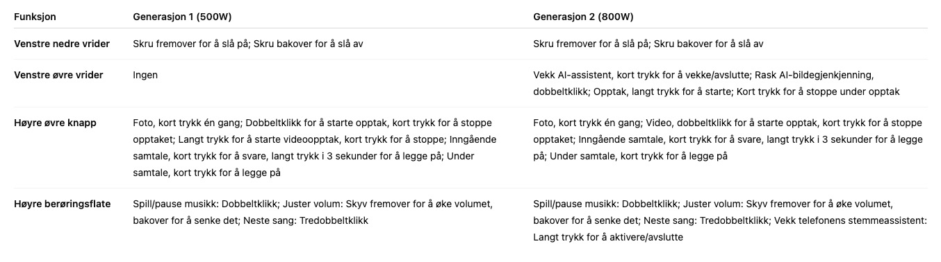 2. generasjon AI Smart Glasses: Hold knappen over venstre tempel nede for å starte opptaket. Trykk på nytt for å stoppe opptaket.